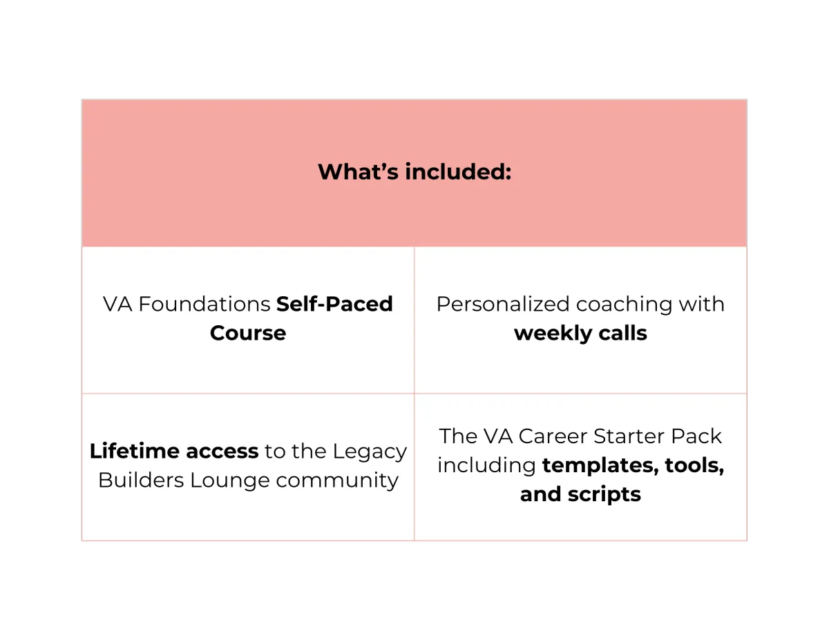 This is your fast-track path to becoming a confident, client-ready VA with the skills, tools, support, and accountability you need to actually get hired.