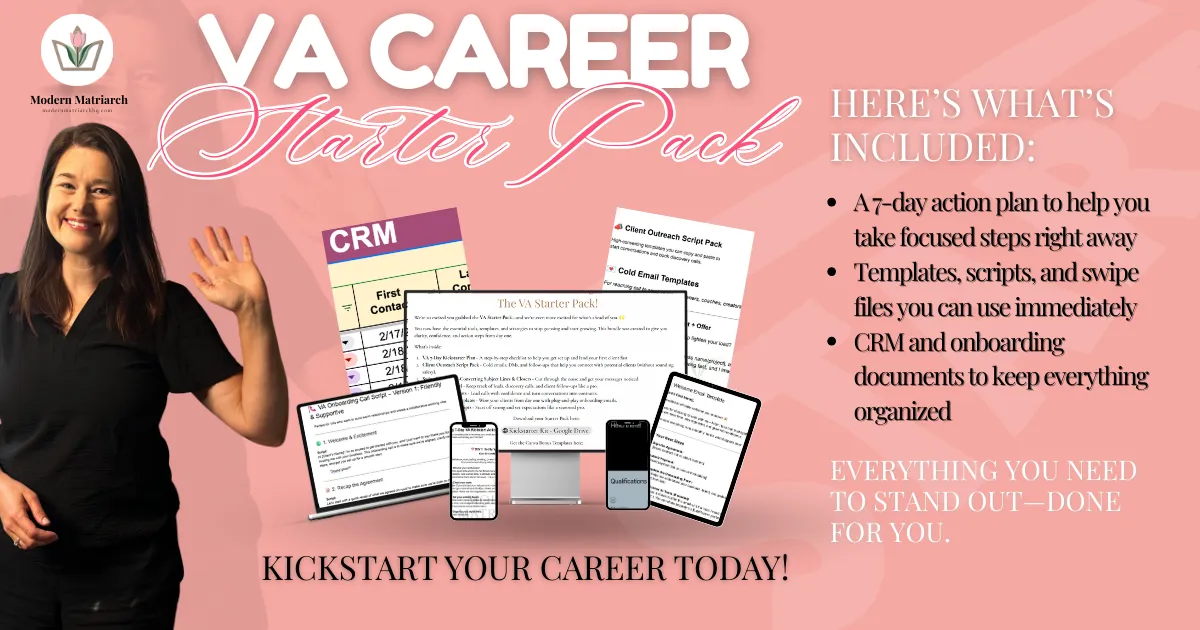 The VA Career Starter Pack gives you ready-to-use templates and tools to set up your online presence and present yourself with confidence from day one.